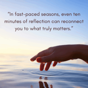 In our fast-paced world, even ten minutes of consistent reflection can quiet the noise and reconnect us to what matters. Start small, just ten minutes a day and build from there. For me, evenings work best. While some give God the first part of their day, I’ve found that ending my day with reflection, prayer, and gratitude helps me process the day’s highs and lows and prepare my heart for tomorrow.